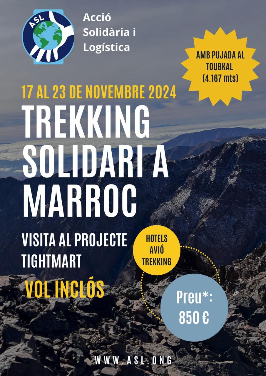 Ens complau convidar-vos a participar en el Viatge Solidari al Marroc, que tindrà lloc del 17 al 23 de novembre de 2024, organitzat per Acció Solidària i Logística (ASL). Aquest viatge és una oportunitat única per combinar l’aventura amb la solidaritat, tot contribuint a un projecte que millora la vida de la comunitat de Tighmart, a l’Alt Atles.